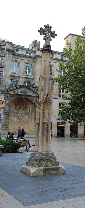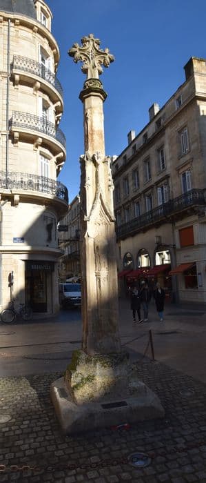 Le fût de la croix seul est ancien. La croix proprement dite a été refaite au début du 20e siècle, reproduction fidèle de l'ancienne ou inspirée d'une croix de l'époque. La croix est désignée dans un document de 1518. Une plinthe carrée surmontée d'un socle de même forme passant à l'octogone, sert de base au fût. Ce fût est entouré de quatre pilastres, espèces de contreforts surmontés de clochetons et réunis au milieu par des arcs à contre courbes, dont l'extrados est couvert de choux frisés et l'intrados polylobé. Ces arcs servent de dais à quatre statuettes. Les pieds de ces figures reposent sur des pilastres hexagones à demi engagés, s'élevant entre les contreforts et couverts d'ornements flamboyants. Au-dessus des dais, le fût octogone s'élève en se rétrécissant jusqu'à la corniche.