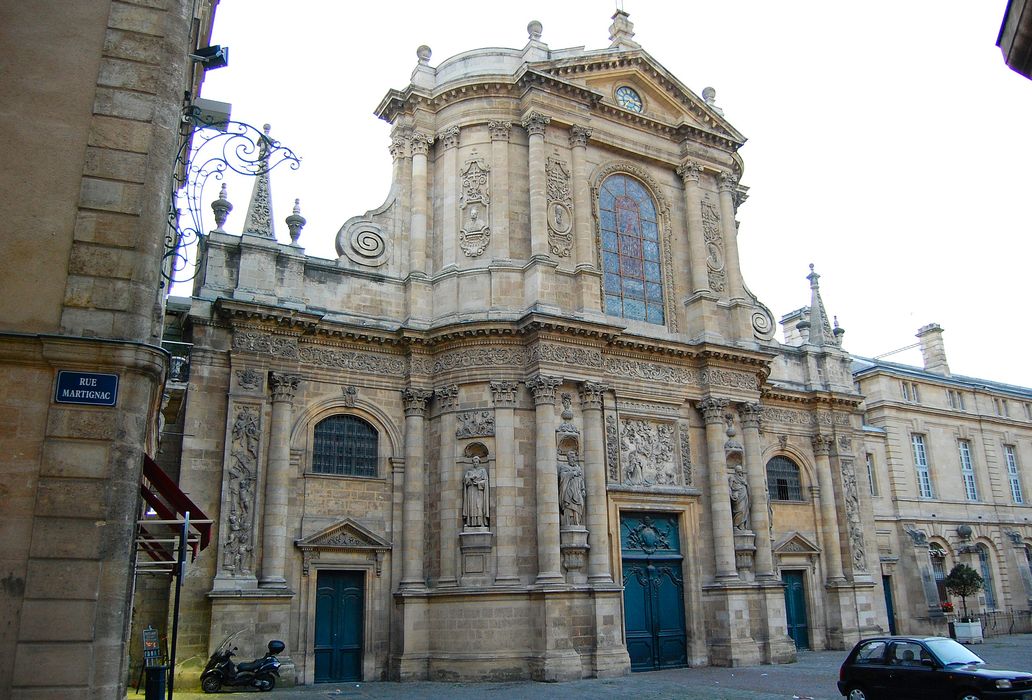 Au 12e siècle, un couvent de Dominicains comportant une église occupait une partie des allées de Tourny. Louis XIV fit raser tout le quartier pour dégager les abords du château Trompette. En 1683, les Jacobins achetèrent un terrain. La construction débuta en 1684 sur les plans établis par Pierre Duplessy-Michel. En 1693, à la mort de Duplessy, les travaux sont repris par l'architecte Mérisson. La construction de l'édifice est achevée sans doute en 1707. Le décor de la façade fut peut-être confié à la famille Berquin qui travaillait pour les Jacobins sur d'autres projets. Pendant la Révolution, l'église servit à des réunions puis devint temple de la Raison et temple de l'Etre suprême. Elle fut rendue au culte après la Révolution. En 1866, la façade fut restaurée et ses décors repris par le sculpteur Capian. De 1834 à 1836, murs et voûte de l'abside, tout ou partie de la voûte de la nef, des arcades et sans doute des chapelles furent peints par Cicéri et Gigun ou Gigun et Waflard. De nouvelles peintures furent réalisées sur la voûte de l'abside en 1873 par Romain Cazes. Le même artiste acheva les peintures du mur de l'abside en 1874.