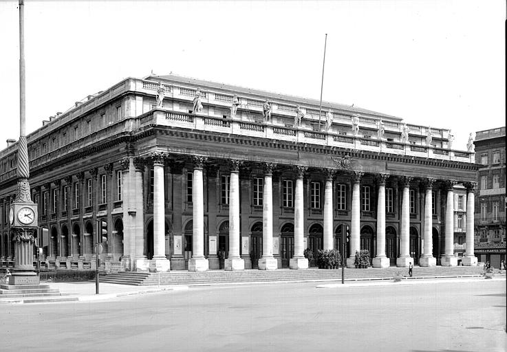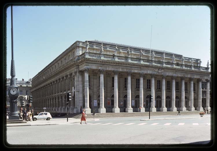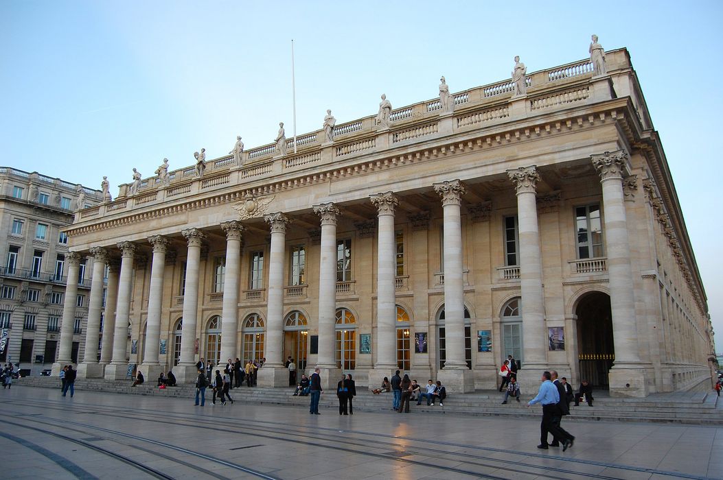 Après l'incendie de l'ancienne salle de spectacle, les travaux du grand théâtre commencent en 1773 sur les plans de Victor Louis ; l'inauguration a lieu le 7 avril 1780. Ce monument est aujourd'hui dans un état relativement proche de ses dispositions d'origine. De plan rectangulaire, l'édifice présente une façade antérieure montée sur emmarchement après 1830, proche du temple gréco-romain. Douze colonnes corinthiennes, un entablement et une balustrade surmontée de douze statues dues à Pierre Berruer et Van Den Drix, représentant les neuf muses et trois déesses, l'ornent. Au-dessus de cette colonnade se trouve une grande terrasse, de plain pied avec un étage d'attique qui règne sur les quatre faces de l'édifice. Sur les faces latérales, le monument comporte de larges galeries destinées à recevoir des boutiques. Des pilastres encadrent les arcades. A l'intérieur, le vestibule se compose de seize colonnes soutenant un plafond à caissons ornés de rosaces. Une cage est surmontée par une coupole. Un escalier monumental se développe au centre, montant vers la salle de spectacle encadrée de cariatides et les loggia ioniques du premier étage. A ce niveau se situent deux foyers au nord et au sud et le grand foyer ayant remplacé, sous le Second Empire, une salle de concert. Le pourtour de la salle de spectacle est décoré de douze colonnes composites. A l'origine, la coupole en bois de la salle était peinte à fresque par Robin d'une figuration de la ville de Bordeaux offrant le nouveau théâtre à Apollon et aux muses. Robin avait également peint les quatre pendentifs ou des génies tenaient les médaillons de Corneille, Molière, Racine et Quinault.