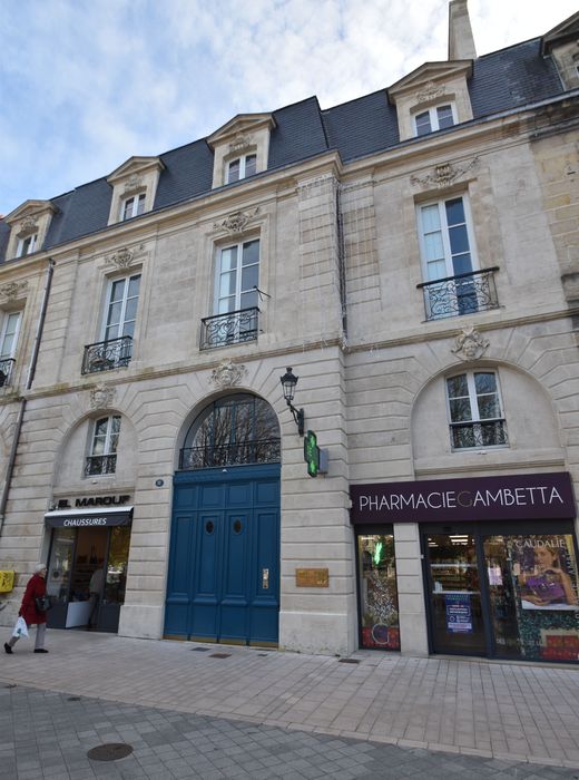 Après la place de la Bourse, celle de Gambetta (ancienne place Dauphine) est l'ensemble architectural urbain le plus important de Bordeaux. Les principales voies y aboutissent. Elle est entourée d'immeubles de la seconde moitié du 18e siècle, bâtis suivant une ordonnance classique. Vers 1745, l'intendant de Tourny, poursuivant son oeuvre d'assainissement et d'embellissement de la ville, ordonna la formation d'une place sur des terrains situés à l'ouest des portes Dauphine et Dijeaux. En 1750, les Jurats contractèrent un emprunt pour fonder et élever les façades des maisons uniformes de la place, composées d'un rez-de-chaussée à arcades portant un étage, un attique et un comble. En 1762, l'architecte fit accepter par l'intendant Boutin un nouveau plan de décor des façades, plus simple que le premier. Il consistait à supprimer les avant-corps prévus et les balustrades, et à surmonter les maisons d'un simple entablement et d'un comble. La place ne fut achevée qu'entre 1770 et 1780, mais le style reste celui de la première moitié du 18e siècle. A chacun des angles de la place rectangulaire s'ouvrent deux artères importantes. L'ordonnance des immeubles comporte une façade de pierre de taille. Au rez-de-chaussée, une arcade régulière avec piédroits à bossages encadrant la porte. Un entresol à petites fenêtres est ménagé dans l'arrondi de l'arcade. Au premier étage se trouvent de grandes portes-fenêtres couronnées de mascarons sculptés et munies de balcons à fer forgé. Quelques immeubles comportent un second étage.