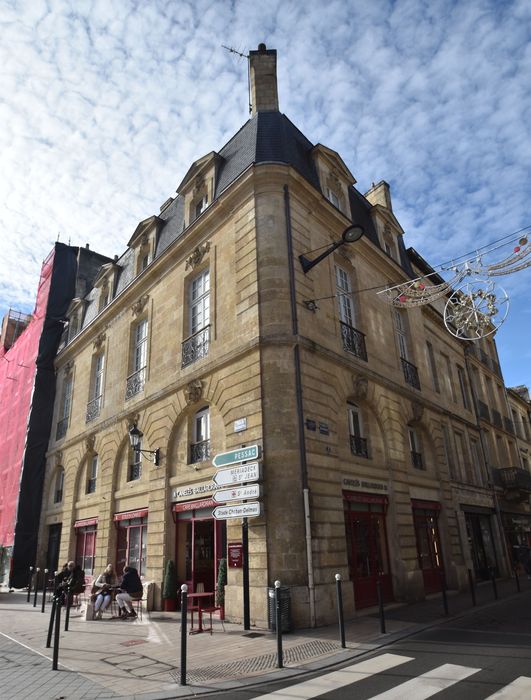 Après la place de la Bourse, celle de Gambetta (ancienne place Dauphine) est l'ensemble architectural urbain le plus important de Bordeaux. Les principales voies y aboutissent. Elle est entourée d'immeubles de la seconde moitié du 18e siècle, bâtis suivant une ordonnance classique. Vers 1745, l'intendant de Tourny, poursuivant son oeuvre d'assainissement et d'embellissement de la ville, ordonna la formation d'une place sur des terrains situés à l'ouest des portes Dauphine et Dijeaux. En 1750, les Jurats contractèrent un emprunt pour fonder et élever les façades des maisons uniformes de la place, composées d'un rez-de-chaussée à arcades portant un étage, un attique et un comble. En 1762, l'architecte fit accepter par l'intendant Boutin un nouveau plan de décor des façades, plus simple que le premier. Il consistait à supprimer les avant-corps prévus et les balustrades, et à surmonter les maisons d'un simple entablement et d'un comble. La place ne fut achevée qu'entre 1770 et 1780, mais le style reste celui de la première moitié du 18e siècle. A chacun des angles de la place rectangulaire s'ouvrent deux artères importantes. L'ordonnance des immeubles comporte une façade de pierre de taille. Au rez-de-chaussée, une arcade régulière avec piédroits à bossages encadrant la porte. Un entresol à petites fenêtres est ménagé dans l'arrondi de l'arcade. Au premier étage se trouvent de grandes portes-fenêtres couronnées de mascarons sculptés et munies de balcons à fer forgé. Quelques immeubles comportent un second étage.