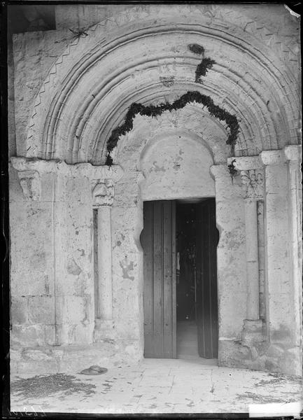 Eglise romane à deux nefs séparées par des arcs ogivaux retombant sur des piliers octogones. Porche et portail à voussures moulurées et tympan sans linteau. Arc externe couvert d'un chevron en zig-zag retombant en cul de lampe. Au nord, deux personnages frustes et mutilés. Au sud, deux autres personnages faisant la cabriole. Le quatrième arc retombe sur des colonnes à chapiteaux ornés (oiseaux montés sur quadrupèdes ; cinq personnages vêtus de longues robes). Porche du 17e siècle. Clocher arcade dont le trumeau entre les deux baies est une grosse colonne. Charpente ornementée.