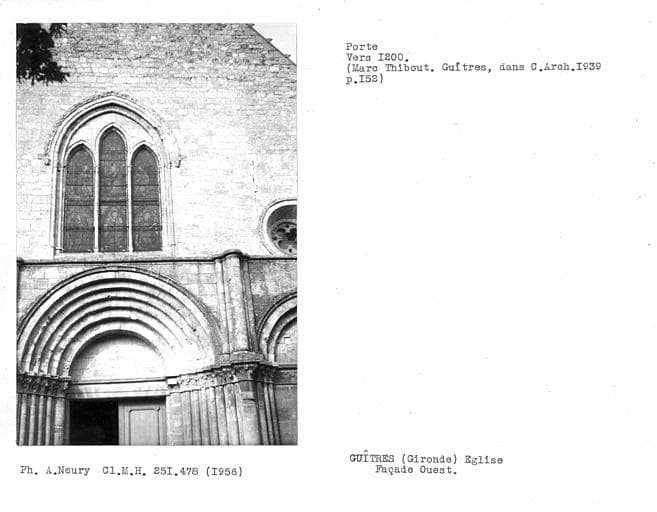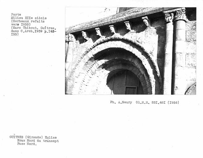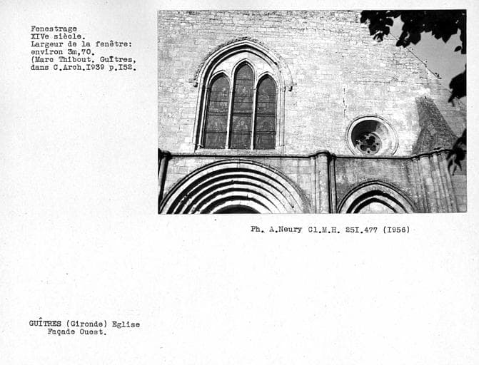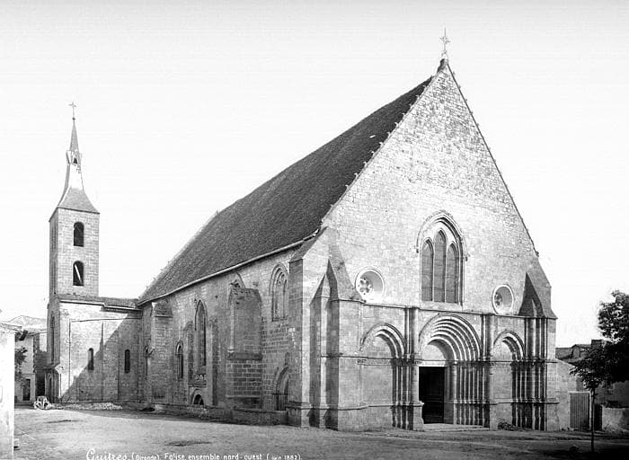 L'abbaye de Guîtres, de l'ordre de Cluny, a été fondée au plus tard pendant la dernière moitié du 11e siècle. L'église et la maison conventuelle sont encore visibles. L'église en forme de croix latine est romane, composée de trois nefs. L'abside est circulaire, voûtée en cul de four et s'ouvre par cinq ouvertures légèrement ogivales sur un déambulatoire flanqué de trois absidioles. Le transept est voûté en berceau et deux petites absides s'ouvrent sur la face orientale de ses bras. La croisée est surmontée d'une coupole sans pendentifs. La nef principale et les nefs latérales portent la trace de remaniements successifs. De la partie primitive ne subsistent que les murs latéraux des trois premières travées orientales. Les voûtes romanes ont été remplacées au 13e siècle. La façade occidentale porte également la trace de remaniements. La partie basse du 13e siècle est richement décorée d'arcatures. Elle est surmontée d'un pignon du 15e siècle. La charpente qui couvre la nef date du 15e siècle.