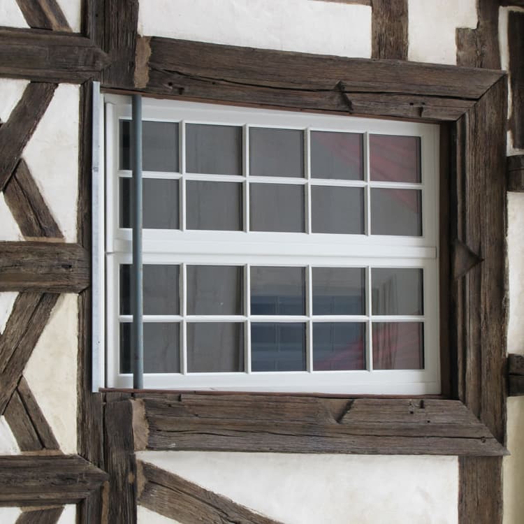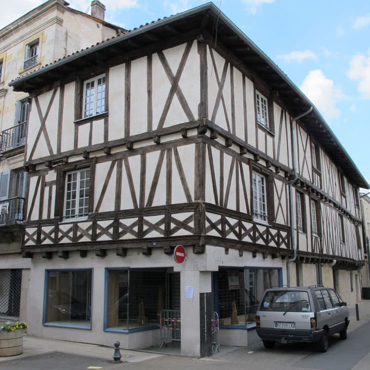 Maison à pans de bois avec moulures sculptées.