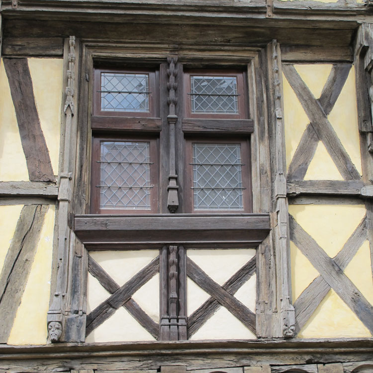 Maison du 15e siècle à deux étages sur rez-de-chaussée, chaque étage faisant saillie sur le précédent et reposant sur un bandeau de bois sculpté. Les montants des fenêtres autrefois à meneaux sont également sculptés. A l'angle de la maison et entre les fenêtres se trouvent de grosses poutres ornées de personnages. A droite, un homme nu mutilé volontairement, avec un chien à la base. Au centre, un animal à tête humaine, la base de la poutre formant niche. A gauche, une femme en robe à plis est agenouillée. Un ange sur le cul de lampe.