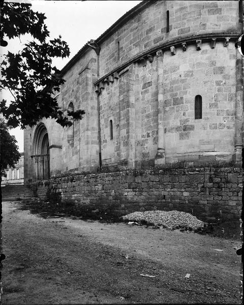 Clocher fortifié dont l'étage supérieur porte l'année 1673. Chapiteaux historiés de style 12e siècle (Adam et Eve ; Agneau accolé d'une croix ; Adoration des mages). Le portail s'ouvre à l'ouest d'une ouverture en plein cintre précédée de piédroits cantonnés de colonnes, le tout surmonté d'arcs en retrait. Chapiteaux et arcs présentent des sculptures de type roman, dont une femme tenant un crapaud qui la tète.