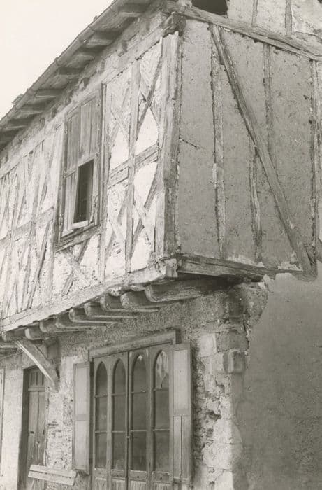 Ancienne maison seigneuriale présentant des façades construites selon la technique habituelle des maisons à pans de bois. Au rez-de-chaussée, le mur de briques, percé de deux fenêtres, d'une porte et d'une vitrine, soutient un unique étage placé en encorbellement. Un quadrillage de poutres assure l'armature de l'ensemble dont les hourdis sont constitués d'un amalgame de plâtres et de briques disposées parfois en biais pour donner l'apparence d'un appareil obliqué. Au rez-de-chaussée, un chaînage de pierre renforce l'angle des murs. Le mur de la façade sur cour se termine par une corniche à génoise à un rang. Un toit en tuiles canal recouvre le tout.