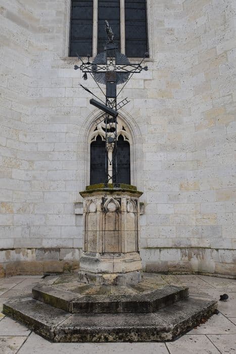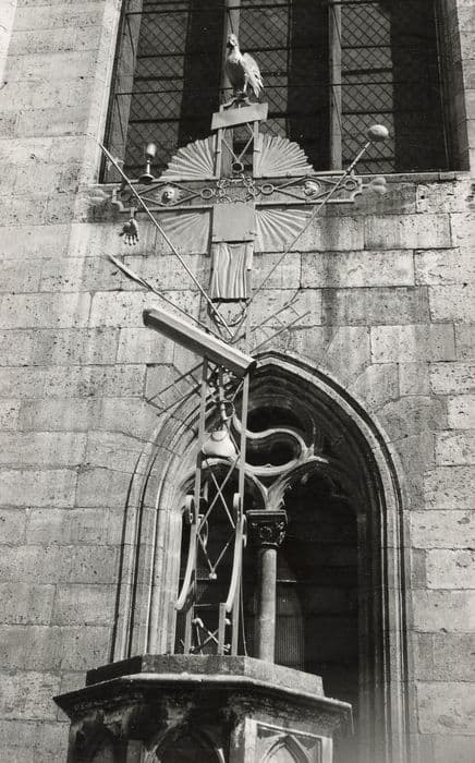Croix ajourée surmontée d'un coq. L'éponge est fichée au bout d'un roseau, lui-même fiché sur le bras droit. La lance est située sur le bras gauche auquel sont de plus accrochés un calice à la partie supérieure et une main à la partie inférieure. Divers éléments symboliques la complètent : lune, soleil, voile, clou, marteau, tenailles, ossements, couronne d'épines entre les bras de la croix, sabre, échelle, jonc, colonne, bourse et pot. Le centre de la croix est entouré de rayons.