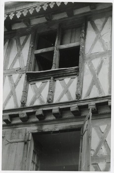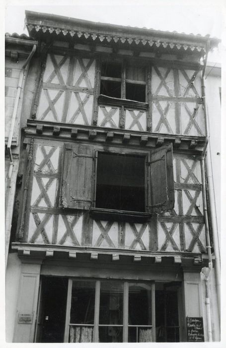 Maison à deux étages, à colombages, le premier étage débordant sur le rez-de-chaussée, le second sur le premier. Le rez-de-chaussée est occupé par une boutique. Le premier étage, dont l'extrémité des poutres de soutien est apparente, est divisé horizontalement en trois registres, et verticalement en six, par des poutres en X. Il est limité de chaque côté par une mince colonnette en bois, terminée par un pinacle. Le second étage, de même facture que le premier, ne comporte que deux registres horizontaux. L'extrémité des poutres de soutien est également apparente, ainsi que celle des chevrons supportant le toit débordant. La face arrière, sur une cour, a conservé un escalier en pierre à trois révolutions, orné d'une rampe en fer forgé du 18e siècle.