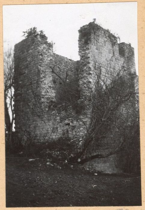 La terre est confisquée par le roi d'Angleterre à la fin du 13e siècle. Du château, seul subsiste le donjon carré. Porche en arc brisé. Emplacement d'une bretèche dont il reste les corbeaux. Fenêtre géminée sur la face est, à colonne plate, dont le sommet est trilobé. Du côté sud, une espèce de soupirail carré s'enfonce dans le sol de la tour et devait donner accès à une cave ou à un souterrain. Courtines et tours ont disparu.