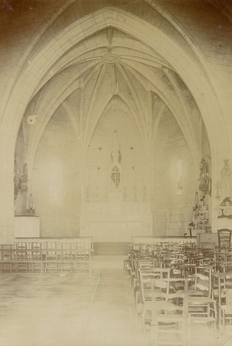 L'église se compose d'une nef et d'un chevet pentagonal. Les voûtes en grandes croisées d'ogives recouvrent deux travées. Un arc triomphal, orné de moulures prismatiques, forme la séparation de la nef et du choeur. La chapelle ou galerie sud est une adjonction. Le choeur est voûté d'ogives avec liernes et tiercerons formant une étoile. Les branches d'ogives retombent sur des culs de lampe ornés (crocodile attaché ; clerc chevauchant un porc).