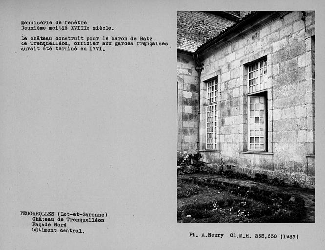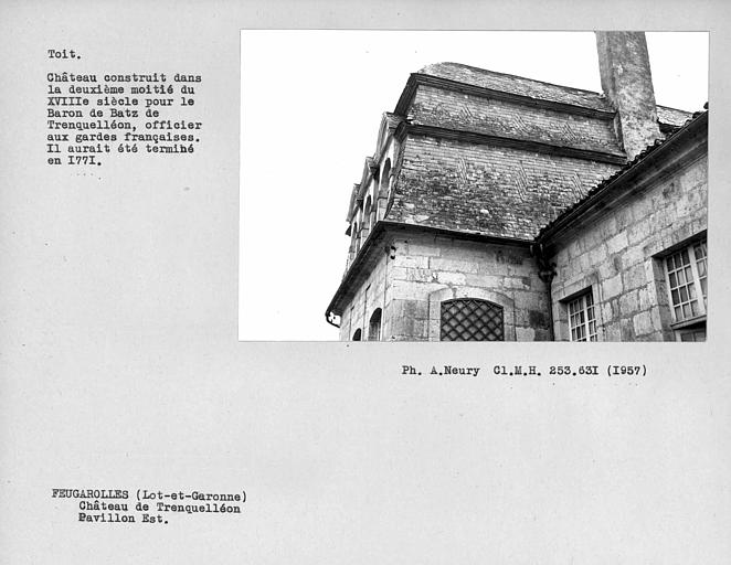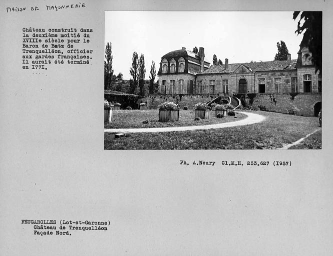 Les façades et les couvertures (cad. A 394) : inscription par arrêté du 16 février 1951. Arrêté du 12 novembre 2015 : [...] vu l'arrêté du 16 février 1951 portant inscription des façades et toitures du château, la commission régionale du patrimoine et des sites (CRPS) de la région Aquitaine entendue en sa séance du 17 septembre 2015, considérant que le château de Trenquelléon à Feugarolles (Lot-et-Garonne) présente un intérêt suffisant pour en rendre désirable la conservation en raison de son histoire et de ses qualités architecturales et paysagères, la commission se prononce à l'unanimité pour l'extension de l'inscription à la totalité du château de Trenquelléon à Feugarolles (Lot-et-Garonne) avec les communs, la cour intérieure, le portail, ses jardins, le pigeonnier, la source, l'ancien portail, l'ancienne dépendance hydraulique et le mur de soutien des jardins soit l'ensemble de la parcelle 13 d'ouest en est jusqu'à la limite du pigeonnier. Section ZN, parcelle 13 de 16 ha et 18 ares et 90 centiaires de la commune (plan annexé). L'arrêté du 12 novembre 2015 annule et remplace celui du 16 février 1951.