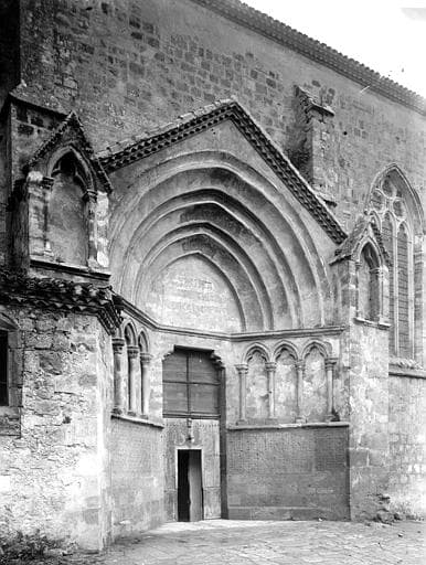 La nef aux chapiteaux sculptés remonte au 13e - 14e siècle. La façade est flanquée de deux tours rondes symétriques. Le portail possède des chapiteaux ornés de figures fantastiques. Le portail nord est surmonté de douze niches qui auraient contenu les statues des apôtres, selon la tradition détruites au cours des guerres de Religion. Le clocher repose sur les piliers de la voûte du choeur. Autrefois adossé à l'église se trouvait le couvent des Bénédictins, qui communiquait avec elle par la sacristie et une chapelle latérale. Le couvent fut détruit à la Révolution.