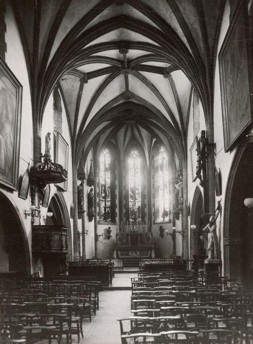 L'édifice paraît avoir été construit d'un seul jet à la fin du 15e siècle. Une vaste nef comprenant quatre travées contrebutées par des chapelles latérales, dont deux plus larges forment les bras de transept, précède une abside polygonale à sept côtés. Voûtes en étoile. Clés de voûtes sculptées. A l'extérieur, façade du 18e siècle surmontée d'un clocher à arcades.