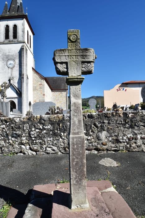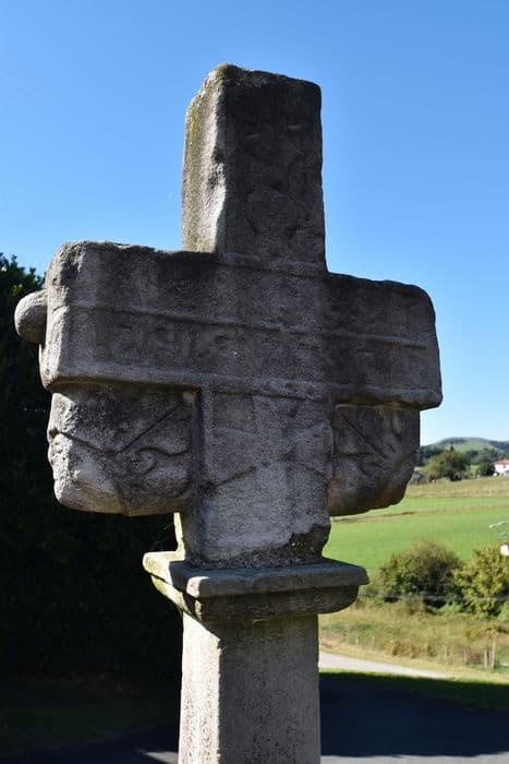 La croix est posée sur un pilier carré aminci. Ses bras se terminent sur une petite excroissance sphérique. Les bras horizontaux sont soutenus par deux têtes sculptées dans la masse. L'une des faces porte au-dessous d'un cercle une inscription impossible à lire. Au revers se devine une sculpture en léger relief, sans doute un Christ.