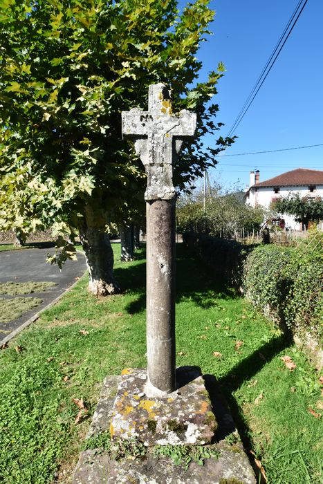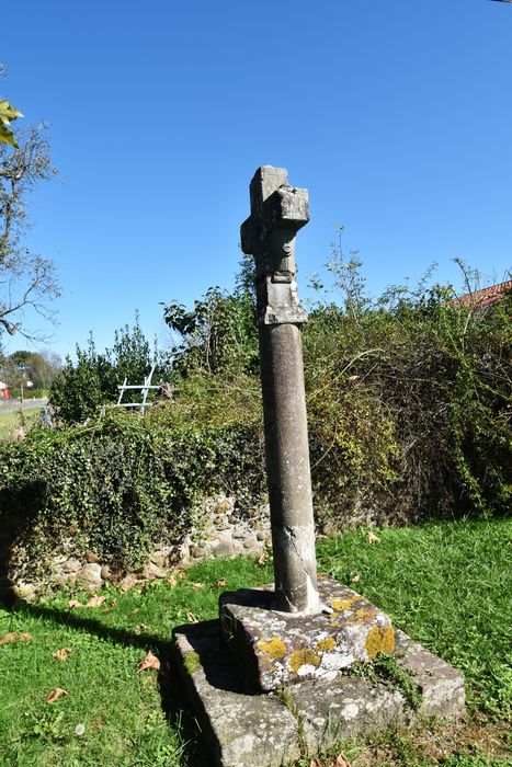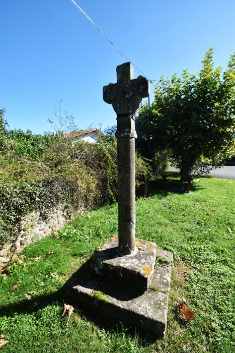Croix installée sur un socle de forme pyramidale de quatre marches et un fût creux de béton armé. Deux têtes, très frustes, soutiennent les bras de la croix, eux-mêmes surmontés, ainsi que le sommet de la croix, de petits éléments décoratifs semi-sphériques. D'un côté est gravé un Christ peu discernable ; de l'autre est représentée une Vierge-mère tenant d'une main l'Enfant et de l'autre un rameau.