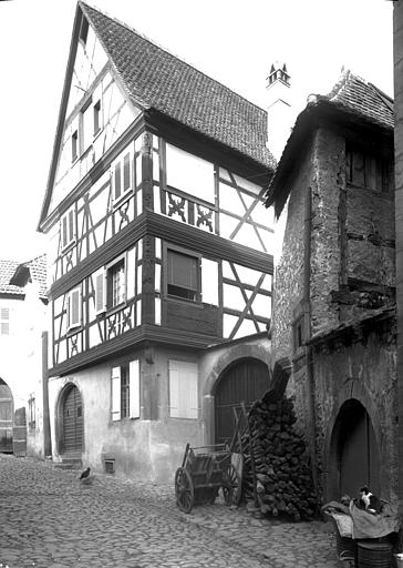 Maison au pan de bois richement décoré, typique de Jean Vollrath, datée de 1601 sur une pierre d'angle. A subi des dommages de duerre.