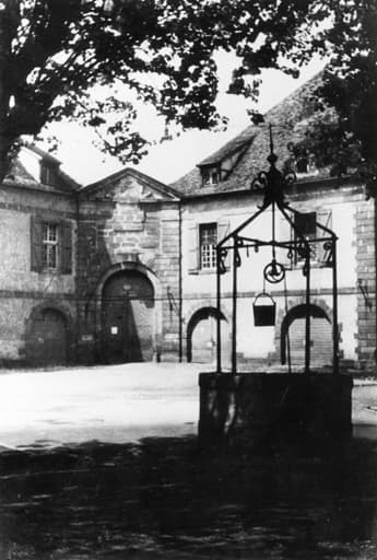 Arsenal du début du 18e siècle déployant deux ailes perpendiculaires de part et d'autre d'un portail cintré dans l'angle de l'îlot.