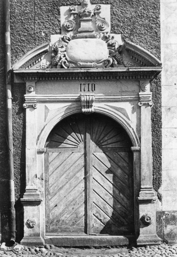 Porte à fronton cintré brisé avec cartouche dans le tympan, jadis peinte en faux marbre, dont le millésime a figuré un temps sur le linteau.