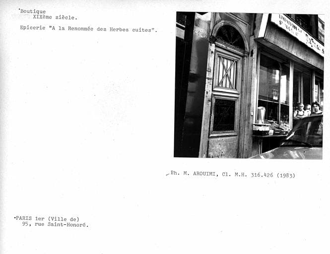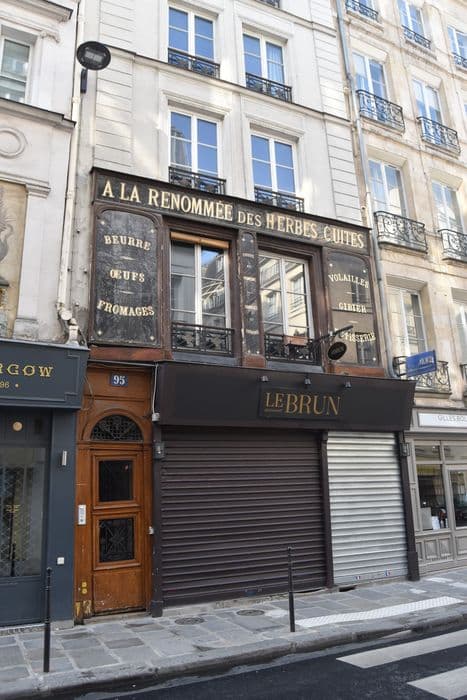 L'immeuble date du début du 19e siècle. Quatre textes dorés fixés sous verres ont été conservés au premier étage de l'immeuble. Il s'agit d'un traiteur épicier à l'enseigne de La Renommée des Herbes Cuites qui a remplacé au début du siècle La Renommée des Epinards. L'intérêt réside dans la situation de ces fixés au premier étage et l'intitulé anecdotique de l'enseigne.
