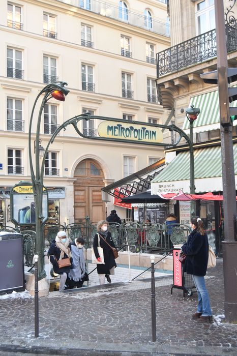 Accès à la station du métro, dessiné en 1900 par l'architecte Hector Guimard pour la Compagnie générale du Métropolitain de Paris. La station est située sur une section de la ligne 4 inaugurée en 1908. L'arrêté de protection porte sur l'ensemble des réalisations subsistantes de Guimard pour le métro.