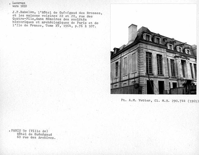 Archives (rue des) 60 ; Quatre-Fils (rue des) 24, 26, 28, 30
