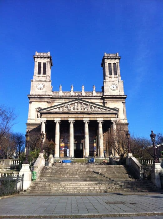 La construction de l'édifice est lancée en 1824 sur les plans de l'architecte Jean-Baptiste Lepère, rejoint peu après par son gendre Jacques-Ignace Hittorff qui modifie quelque peu le projet. Les travaux sont interrompus par les évènements politiques de 1830 et l'église est finalement livrée au culte en 1844. Le décor n'étant pas achevé, les commandes se succèdent jusqu'en 1854. L'église se distingue par son élévation à deux étages de colonnades et par la grande frise peinte à la cire d'Hippolyte Flandrin. Hittorff tire ses références architecturales de l'Antiquité, d'où sa préférence pour l'ordre ionique et l'utilisation de la sculpture en ronde-bosse pour le fronton. Jalon important dans l'architecture religieuse du 19e siècle, cette église fut conçue par Hittorff comme un véritable musée des techniques décoratives disponibles en son temps : peinture à la cire, vitraux peints en verres émaillés, fonte peinte ou dorée, etc.