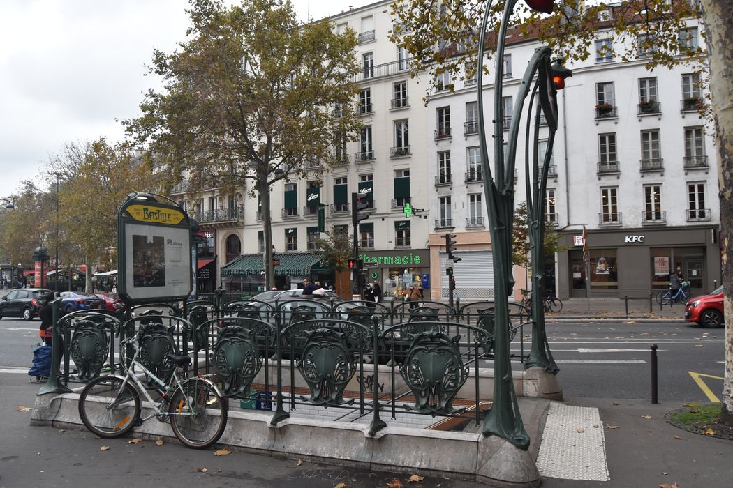 Accès à la station du métro, dessiné en 1900 par l'architecte Hector Guimard pour la Compagnie générale du Métropolitain de Paris. La station est située sur la ligne 1 du métro, inaugurée en 1900. Protégé par un arrêté portant sur l'ensemble des réalisations subsistantes de Guimard pour le métro, l'accès a été démonté lors de l'aménagement des abords de l'Opéra de la Bastille et remonté à l'angle du boulevard Beaumarchais, dans le 11e arrondissement.