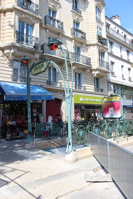 Accès à la station du métro, dessinés en 1900 par l'architecte Hector Guimard pour la Compagnie générale du Métropolitain de Paris. La station est située sur une section de la ligne 4 du métro inaugurée en 1909. L'arrêté de protection porte sur l'ensemble des réalisations subsistantes de Guimard pour le métro.