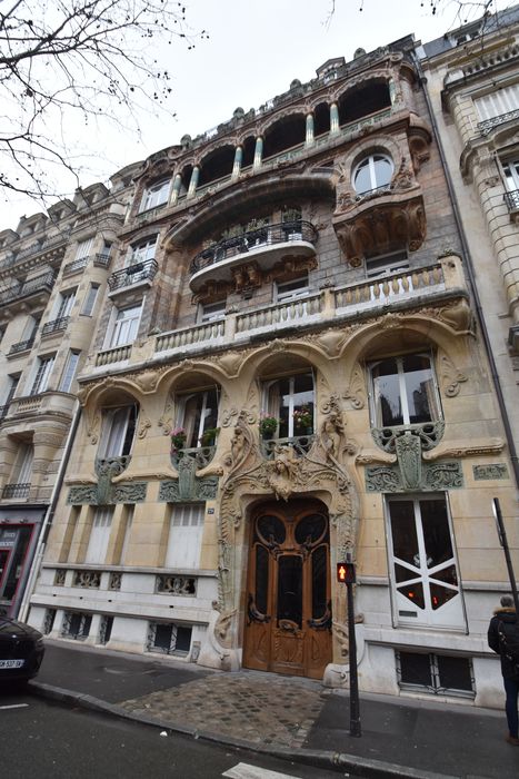 Immeuble de rapport construit par l'architecte Jules Lavirotte en 1900 ; sa façade est primée au concours de la Ville de Paris de 1901. Cette façade s'orne d'un exubérant décor Art Nouveau, réalisé en céramique et servant de véritable vitrine d'exposition aux produits du céramiste Alexandre Bigot, propriétaire de l'immeuble. Les figures sculptées sont dues à Jean-Baptiste Larrivé.