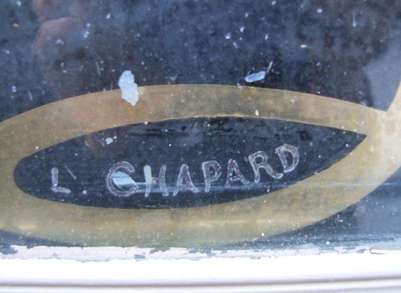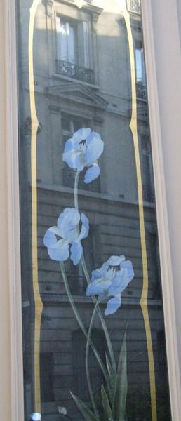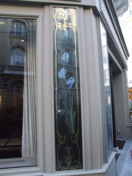 Boulangerie ouverte au début du 20e siècle avec une façade décorée de panneaux fixés sous verre montrant des arabesques Art Nouveau et un motif de gerbe d'iris ; panneaux signés de L. Chapart.