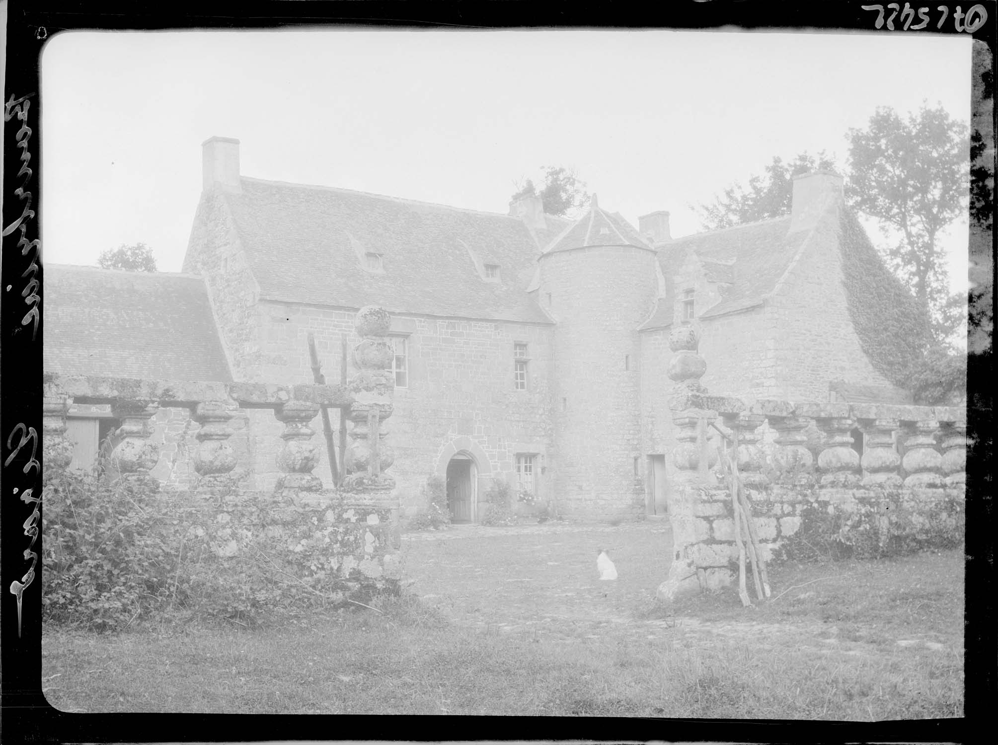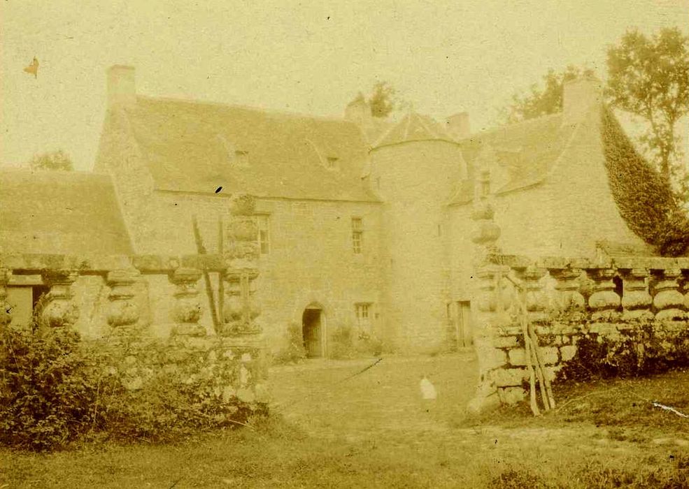 La façade du manoir, l'entrée de la cour, et l'entrée de la propriété avec ses balustres (cad. D 1347) : inscription par arrêté du 20 janvier 1926