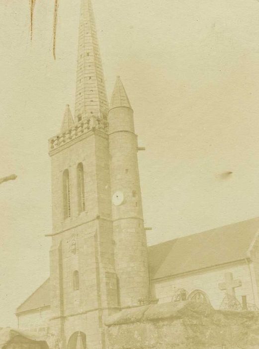 Le clocher de l'église se présente comme une tour carrée surmontée d'une flèche octogonale et flanquée symétriquement sur deux côtés d'une tourelle d'escalier. Une balustrade couronne la tour carrée.