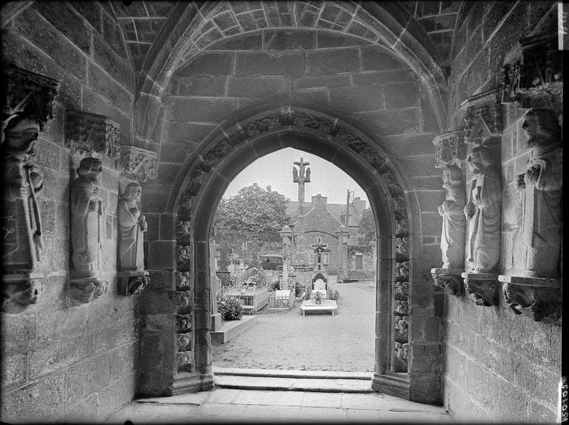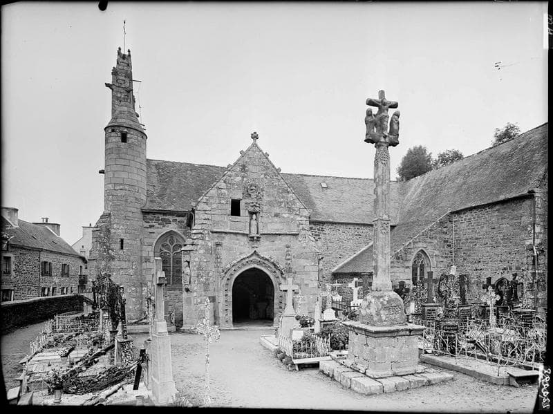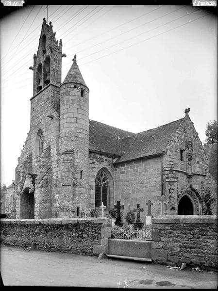 L'église, construite au 15e et 16e siècle, conserve un porche latéral voûté intéressant, orné des statues des apôtres. Au-dessus se trouve une salle qui dut servir de trésorerie. La façade ouest s'agrémente d'un campanile à trois cloches. Le socle du calvaire porte la date de 1758, année qui vit certainement le remaniement de la base, le fût et la partie supérieure de l'ouvrage semblant plus anciens.