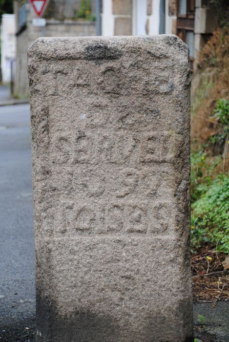 Ouvrages en granit de l'époque du duc d'Aiguillon, ces bornes, disposées au départ des grandes routes, rappellent l'ancienne corvée due pour l'entretien des chemins royaux. De forme rectangulaire, aux angles biseautés, elles portent sur deux faces des inscriptions indiquant la part de l'entretien à la charge de la ville mentionnée. La borne ici concernée porte la mention : "Tâche de Servel ; 1097 toises".
