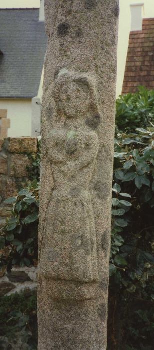 Le calvaire est placé sur un soubassement constitué de deux massifs octogonaux en pierre de taille formant marche. Sur ce soubassement est placé un cube dont les arêtes sont chanfreinées. Une inscription illisible est gravée dans le bloc. La pierre monolithe qui forme le calvaire présente un fût et des arêtes chanfreinées. Une Bretonne vêtue de son costume et de sa coiffe, les deux mains repliées sur la poitrine, est sculptée à la base. Au-dessus, le Christ squelettique, une draperie autour des hanches, est crucifié, les pieds reposant sur une tête de chien.