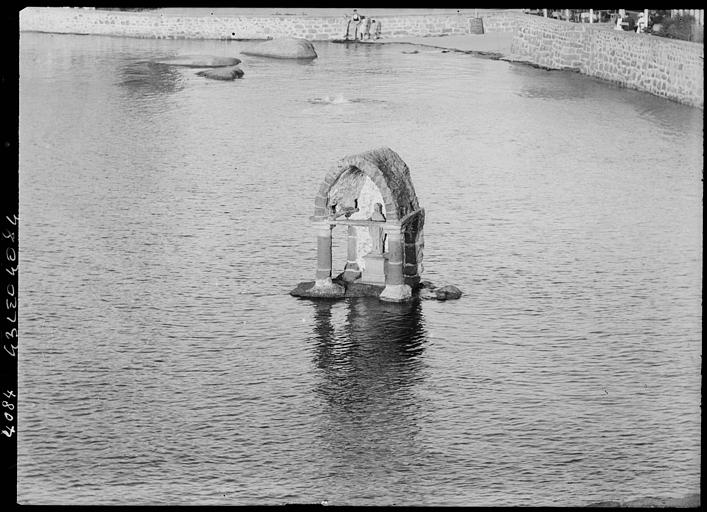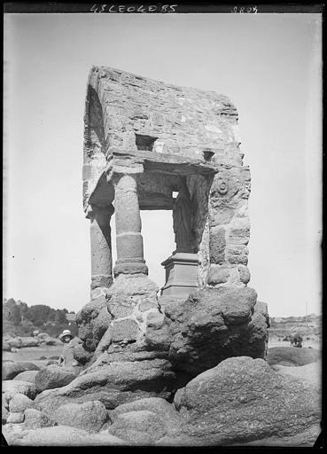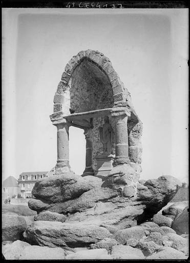 Petit édicule en forme de niche, établi sur un rocher. La niche voûtée avec arcade en tiers point est soutenue par quatre piliers romans et abrite la statue de Saint-Guirec.