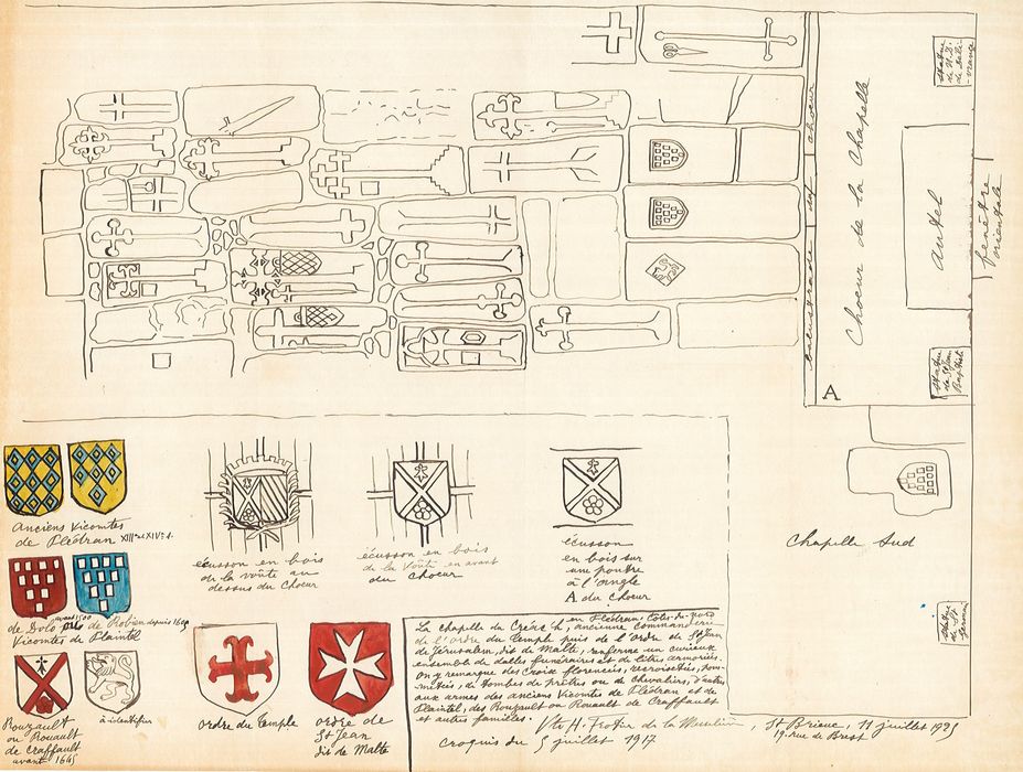 L'édifice conserve un dallage entièrement fait d'anciennes pierres tombales avec des croix en relief taillées dans le granit. La chapelle était une ancienne commanderie de l'ordre du Temple puis de l'ordre de Saint-Jean de Jérusalem, dit de Malte. Les pierres viennent de tombes de prêtres ou de chevaliers. D'autres sont aux armes d'anciens vicomtes.
