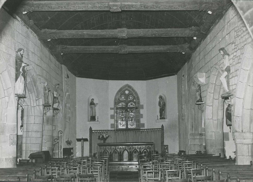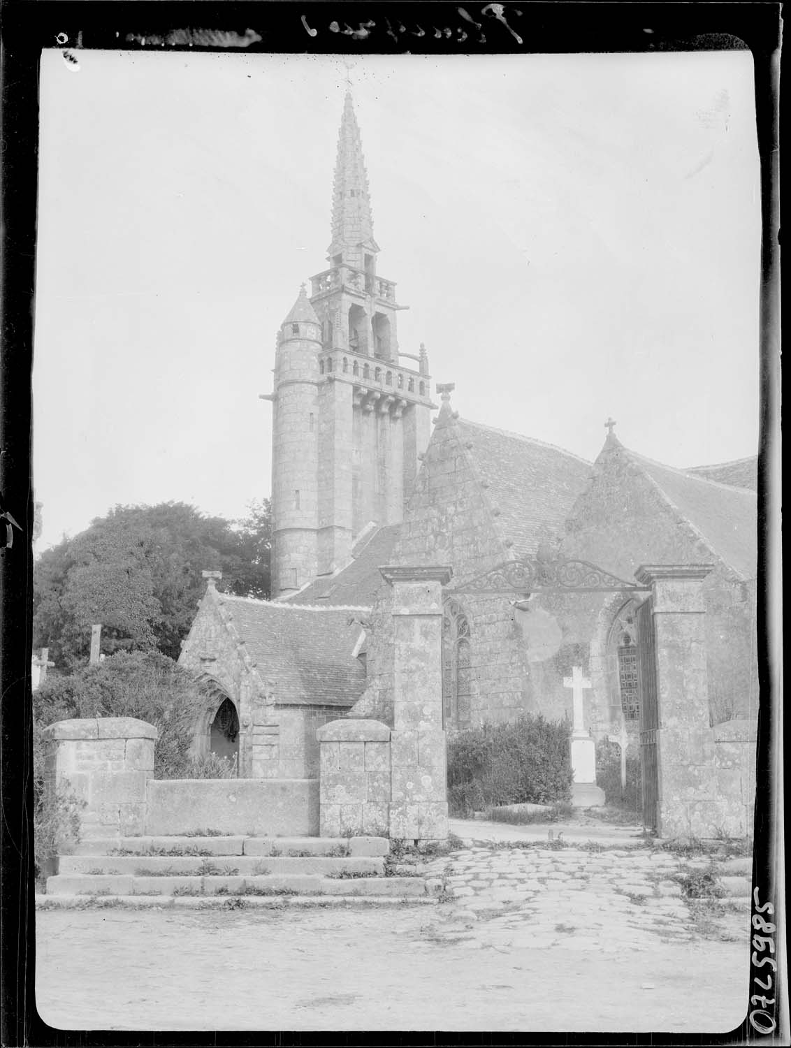 Cette église date, majoritairement, de la fin du 15e et du début du 16e siècle. Les fenestrages du 14e siècle ont été réemployés dans la chapelle du midi. Au 17e siècle, construction du clocher, daté de 1681 à 1687, ainsi que du choeur. Il s'agit d'un édifice à plan cruciforme, avec appendices constitués par le porche sur la face sud et la sacristie. Le chevet est à pans coupés. Appareil de granit irrégulier. La porte d'entrée, en plein cintre, est ornée à son sommet d'un fronton triangulaire soutenu de chaque côté par des colonnes cylindriques en demi-relief. Le sommet du fronton est coupé par une niche à coquille qui repose sur la base du fronton et dans laquelle se trouve une statue. La tour carrée du clocher est ornée à son sommet d'un balcon modilloné et ajouré de petites arcades. A la hauteur de ce balcon se trouve la chambre des cloches, constituée de deux arcades ouvertes. Au sommet de la chambre des cloches se trouve un autre balcon, à balustres duquel part la flèche de pierre à crochets. Le long de la tour, de la base au premier balcon, est accolée une tourelle ronde permettant l'accès au clocher. Ce clocher s'est effondré en 1978. Le porche d'entrée présente un arc légèrement brisé, mouluré, dont la moulure supérieure est ornée de motifs sculptés. De chaque côté sont placées des colonettes surmontées de pinacles. Les rampants du pignon sont ornés de motifs sculptés. La base de chaque rampant s'agrémente de gargouilles. L'intérieur du porche renferme des fresques représentant un cortège funèbre. A l'intérieur, les lambris de la voûte sont peints et les sablières sculptées.