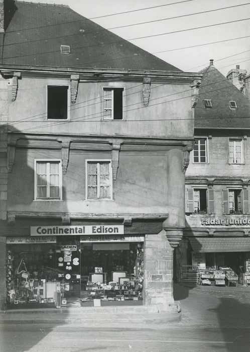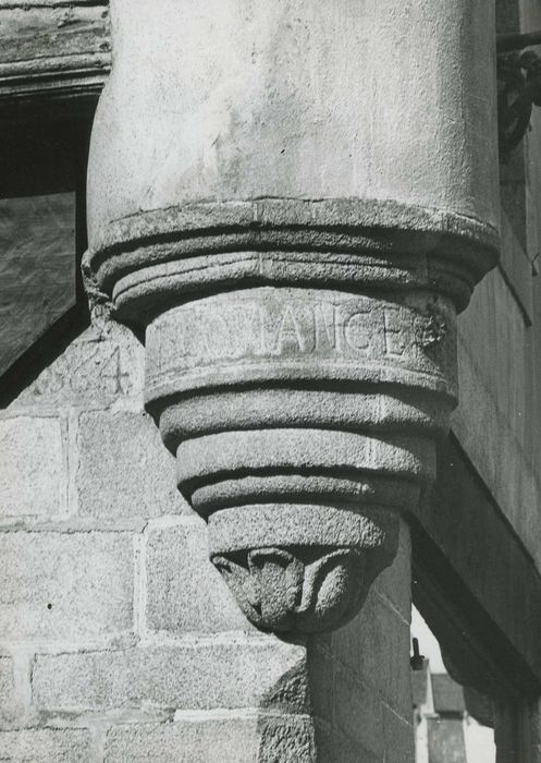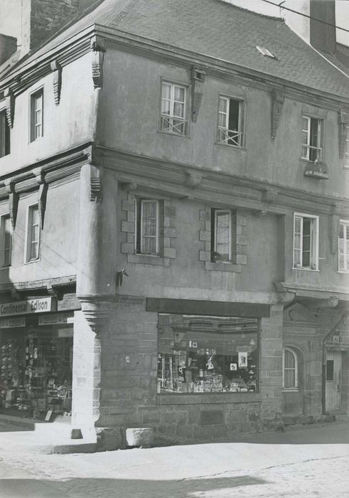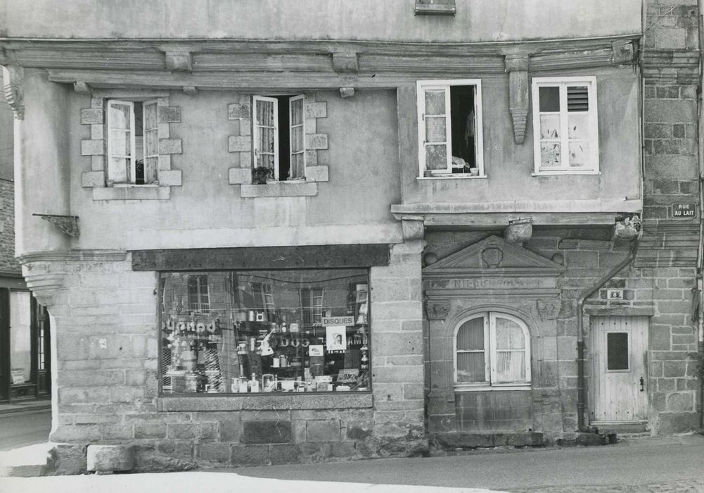 En 1691, Quintin fut érigé en duché. La ville conserve de beaux exemples d'édifices des 17e et 18e siècles. Ici, longue maison à deux étages, avec encorbellements, présentant poutres et supports moulurés. Au premier étage, l'angle est accusé par une colonne s'appuyant sur le culot mouluré. La façade rue au Lait est percée d'une porte à fronton et pilastres.