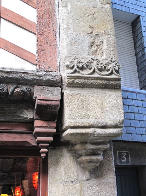La façade de cette maison a conservé sans trop de modification sa disposition ancienne, même au rez-de-chaussée, ce qui est assez rare. Sa construction est entièrement en pan de bois, et les principaux éléments de structure sont apparents. Sablières, montants de fenêtres et consoles sont moulurés et sculptés.