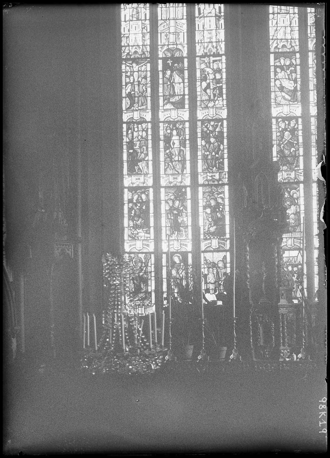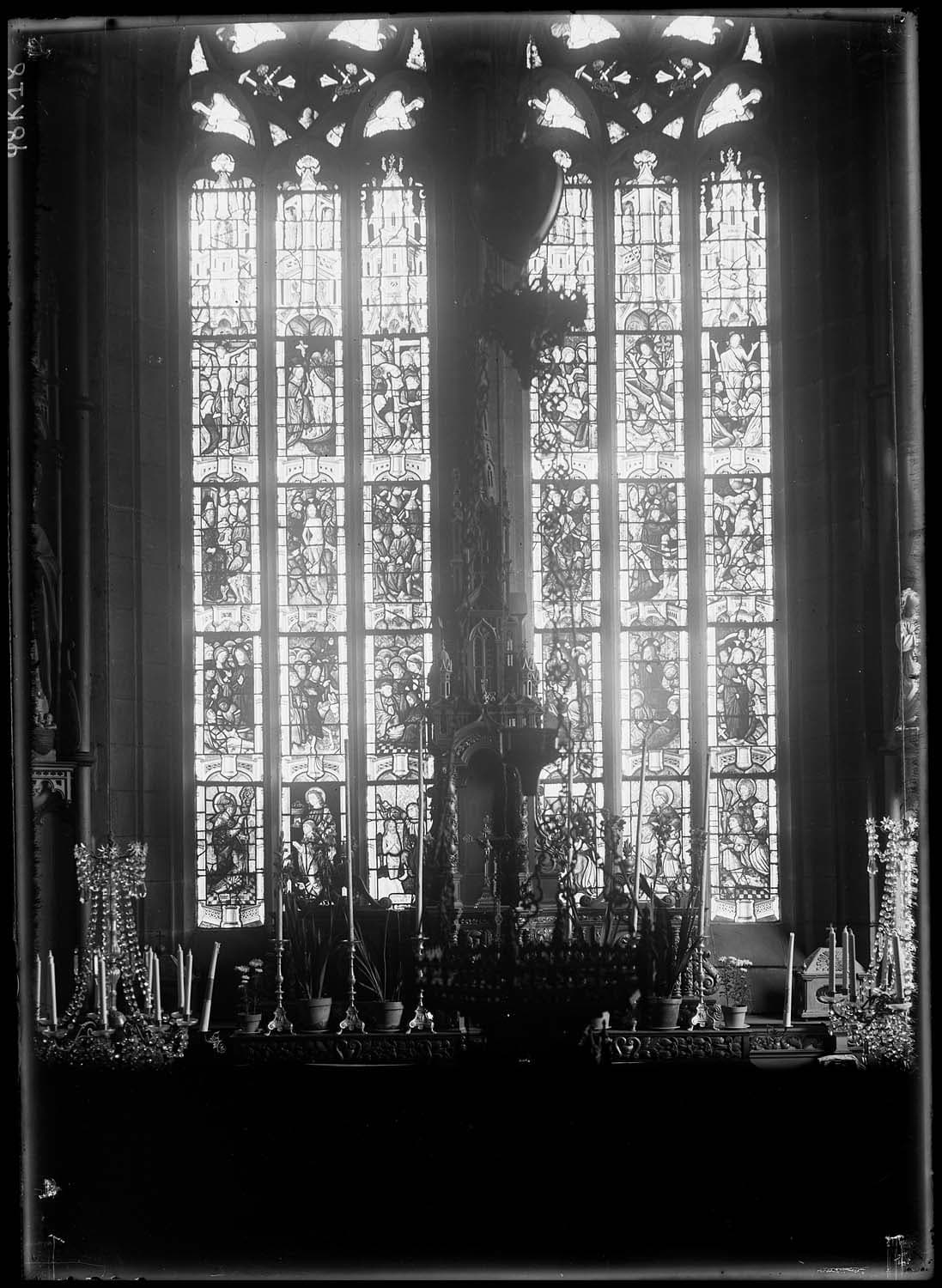 Le chevet conserve une fenêtre jumelée avec vitraux du 16e siècle.