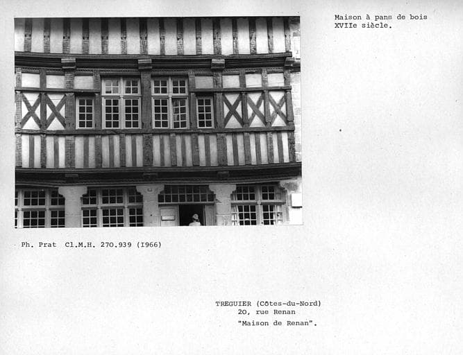 Maison dans laquelle naquit Ernet Renan en février 1823, qui y vécut jusqu'à ses quinze ans. Le rez-de-chaussée est construit en granit, et les étages en pans de bois. L'édifice appartient au 17e siècle et présente les caractéristiques de construction de cette époque en Bretagne.