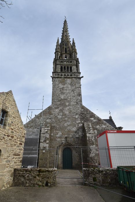 L'église fait partie d'un groupe d'édifices bâtis au 17e siècle, en Bretagne, dans le style de la fin de la période gothique. Construite en granit, l'église se compose d'une nef avec bas-côtés, d'un transept, d'une abside polygonale et d'une chapelle au sud. Trois dates gravées à différents endroits du bâtiment permettent d'en établir les diverses époques de construction (1648 dans le bras nord du transept ; 1655 à l'entrée du choeur ; 1680 au-dessus de la porte de la sacristie). Sur la façade occidentale s'élève un clocher carré surmonté d'une flèche en granit dont le rez-de-chaussée constituait l'ancien porche d'entrée. Le portail principal se situe maintenant au sud, en avant d'un porche de style plutôt classique. L'église a été partiellement détruite par un incendie en 1936.