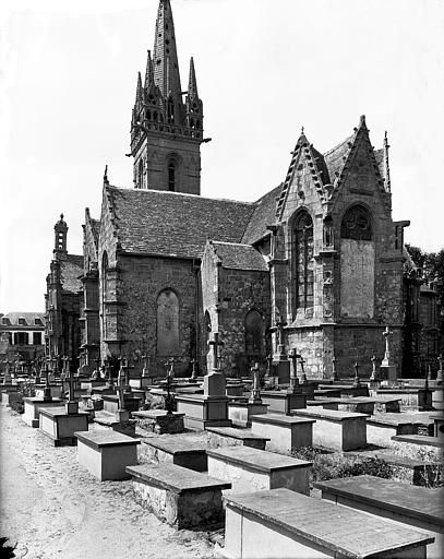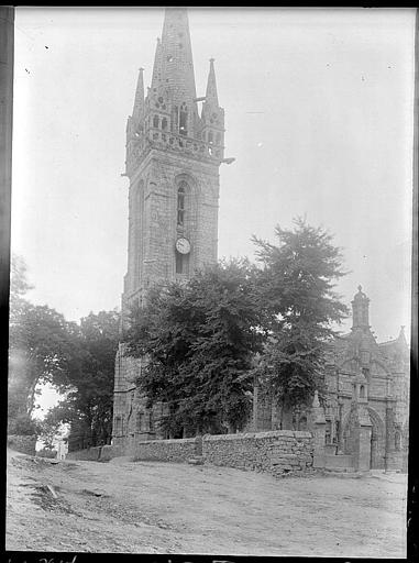 Eglise caractérisant, pour la fin du 16e siècle, l'évolution un peu tardive de l'art religieux en Bretagne. Le clocher, autrefois certainement élevé, est décoré d'ornements en ogive, antérieurs à la Renaissance. La flèche a été tronquée par la foudre et restaurée de telle sorte que les arêtes de la pyramide, au lieu d'être droites, décrivent une légère courbe. Le portail latéral est de 1601. L'intérieur de l'église porte la date de 1594.