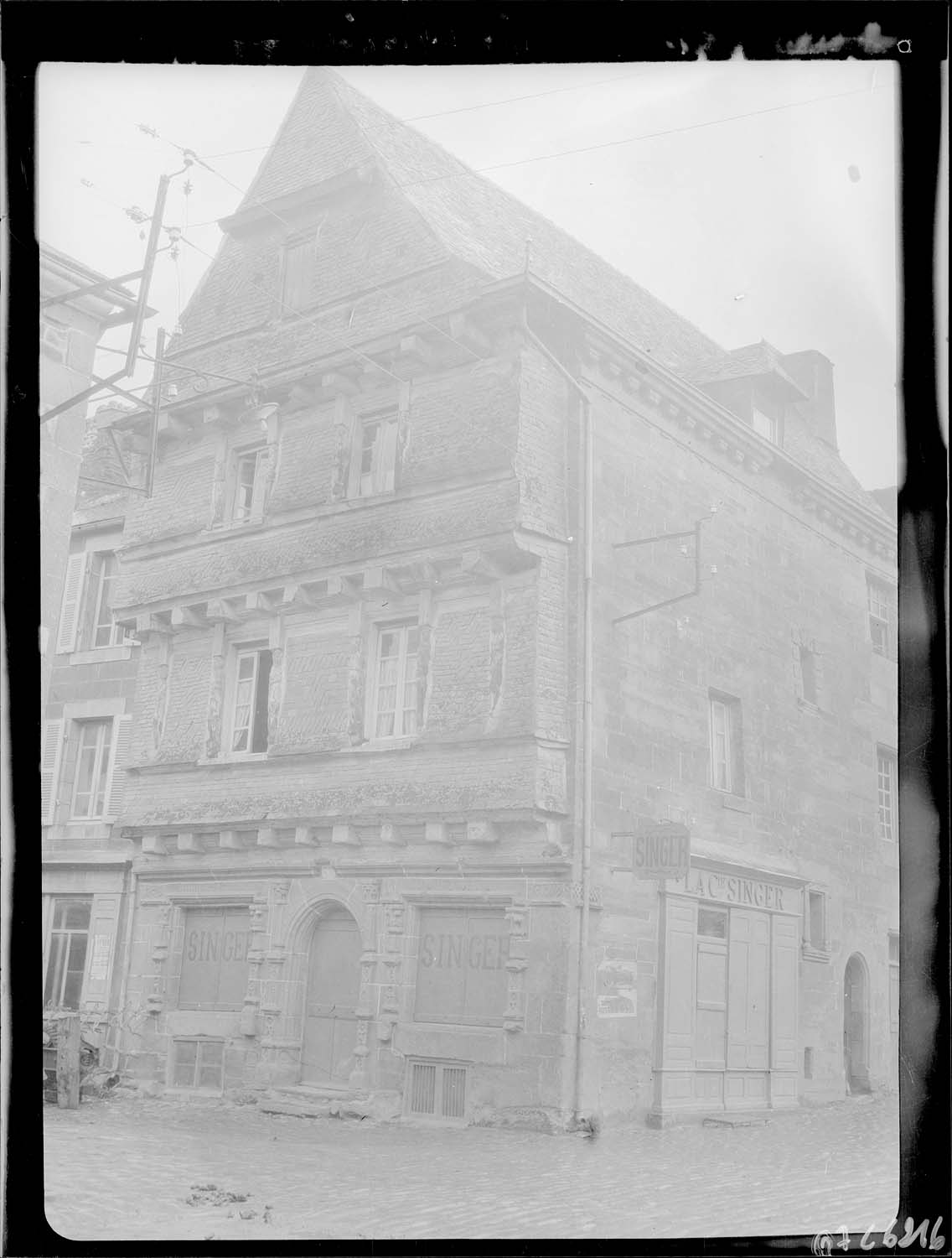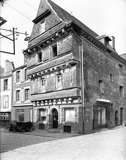 La façade principale obéit à une disposition symétrique. Le rez-de-chaussée en granit comprend une porte centrale en plein cintre, et deux grandes fenêtres décorées de pilastres Renaissance sculptés. Archivolte et linteaux sont également sculptés. Les trois étages supérieurs sont construits en encorbellement les uns sur les autres, supportés chacun par des poutres saillantes de leur plancher, entre lesquelles courent des sablières moulurées. Poteaux de construction et jambages des fenêtres sont décorés de figures en forme de cariatides.