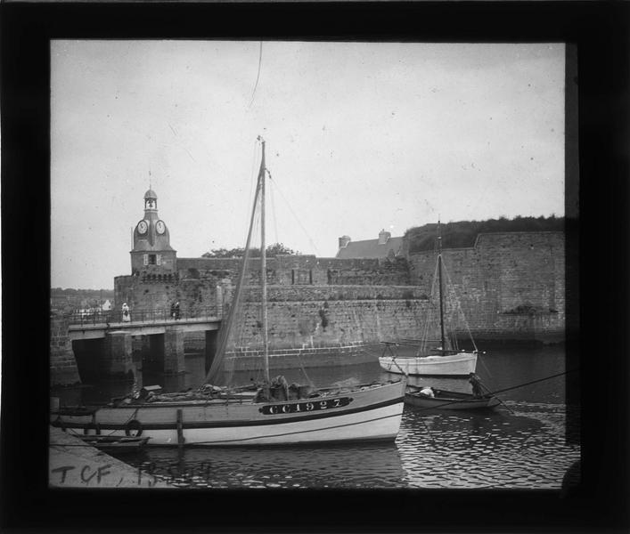 Les premières fortifications de la ville close de Concarneau ont été créées pour protéger le monastère dépendant de l'abbaye de Landévennec qui s'y était établi au 7e siècle. D'abord érigées en bois, elles furent progressivement maçonnées, puis complètement reprises au cours du 15e siècle pour les adapter à l'artillerie. Quelques modifications y furent apportées au cours du 17e siècle : création du ravelin et de la demi-lune au cours de la première moitié du siècle, puis, sous Vauban, adaptation des fortifications aux progrès de l'artillerie, en décoiffant les tours pour y installer des plate-formes d'artillerie. Les remparts actuels sont pratiquement restés dans l'état où ils étaient à cette époque.