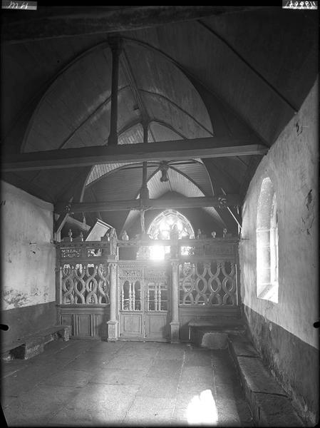 L'intérieur est orné de peintures exécutées sur lambris ainsi que sur l'encadrement de la fenêtre du chevet. Elles datent des 16e et 17e siècles et représentent : Adam et Eve, Saint-Michel, Naissance de la Vierge, Annonciation, Visitation, Présentation au Temple, Jésus parmi les docteurs, Assomption. Sur le soubassement du maître-autel est représentée la Nativité et, sur des socles de chaque côté, les stigmates de Saint-François et un donateur. Les deux autels latéraux présentent également des soubassements peints.