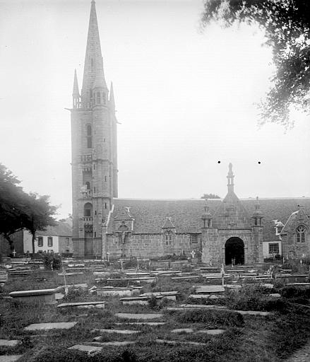 L'église est formée de deux nefs accolées sur lesquelles s'ouvrent des chapelles. L'édifice date en grande partie du 16e siècle. Le clocher date de 1582. La croix se trouvait à l'origine contre le mur d'une propriété dans le bourg. Elle pourrait dater de l'époque carolingienne. C'est une croix de granit monolithe, de forme latine à bras pattés. Le fût est de section rectangulaire et s'amincit vers le haut. Les seuls signes présents sont deux cavités circulaires, l'une au coeur du croisillon, l'autre à la base du fût. Le socle est constitué d'un bloc en forme de meule.