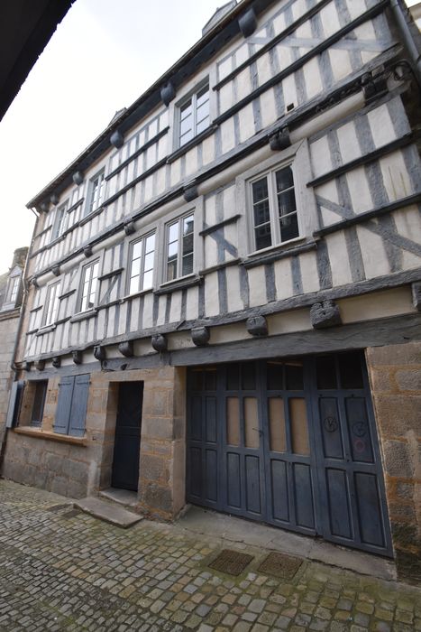 Façade en pans de bois avec crépissage sur lattis. Soubassement en pierre de taille. Maison appartenant au centre ancien de la ville.